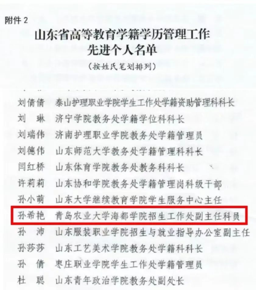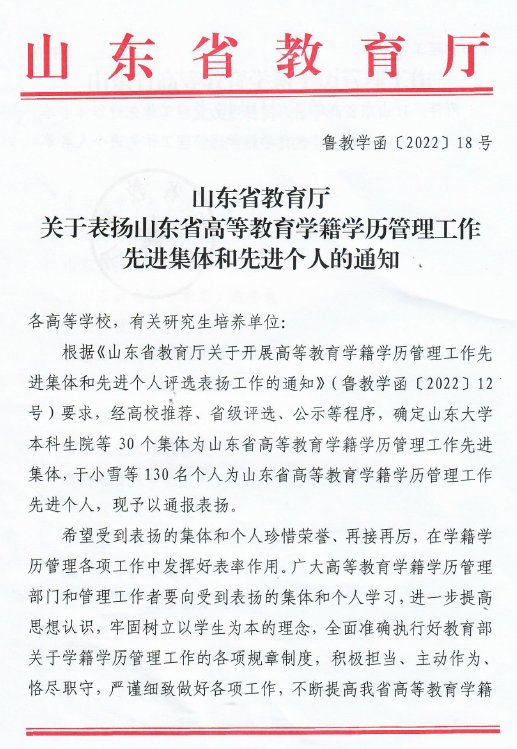在此次山东省教育厅关于开展高等教育学籍学历管理工作先进集体和先进个人评选工作中,孙希艳老师获评“山东省高等教育学籍学历管理工作先进个人”。